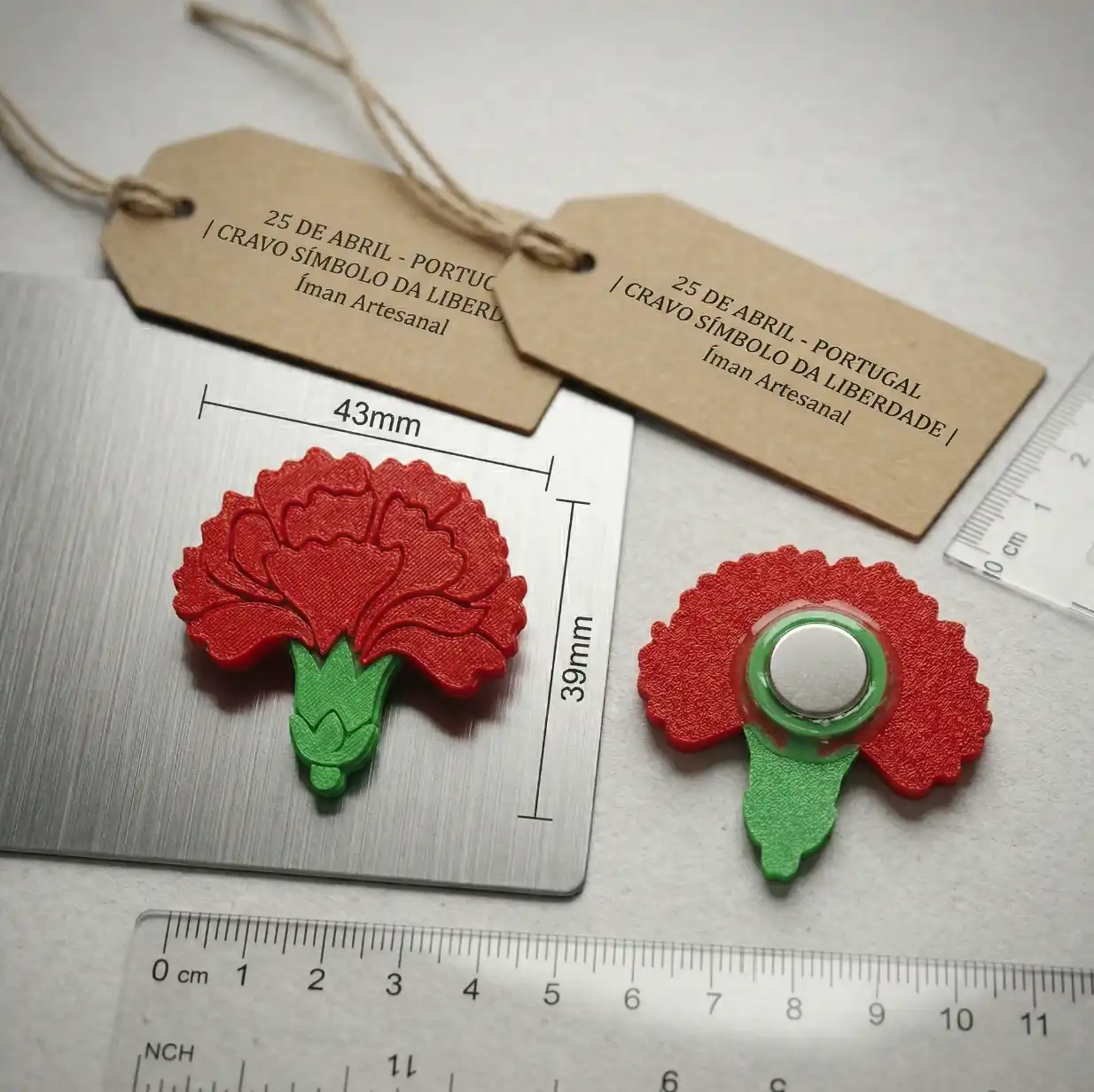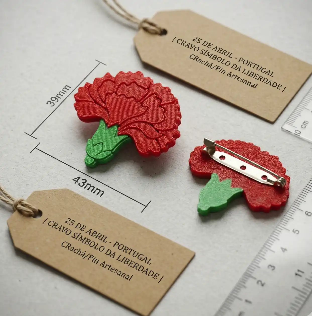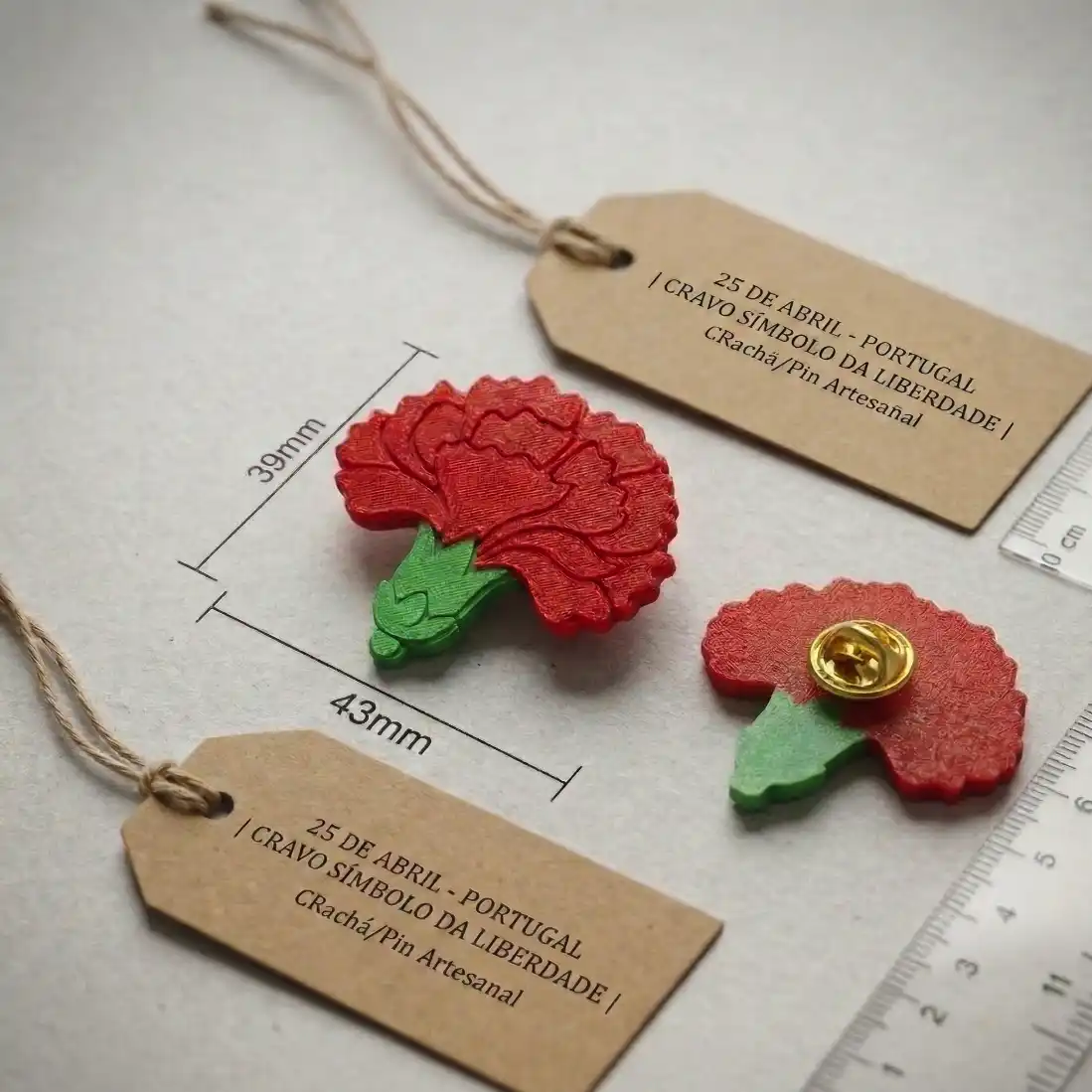 Este crachá/pin representa o icónico Cravo de Abril, símbolo maior da nossa democracia. Ao contrário dos pins de plástico comuns, este modelo é produzido em PLA, um material sustentável de origem orgânica que confere uma textura definida e cores vibrantes que não desbotam.